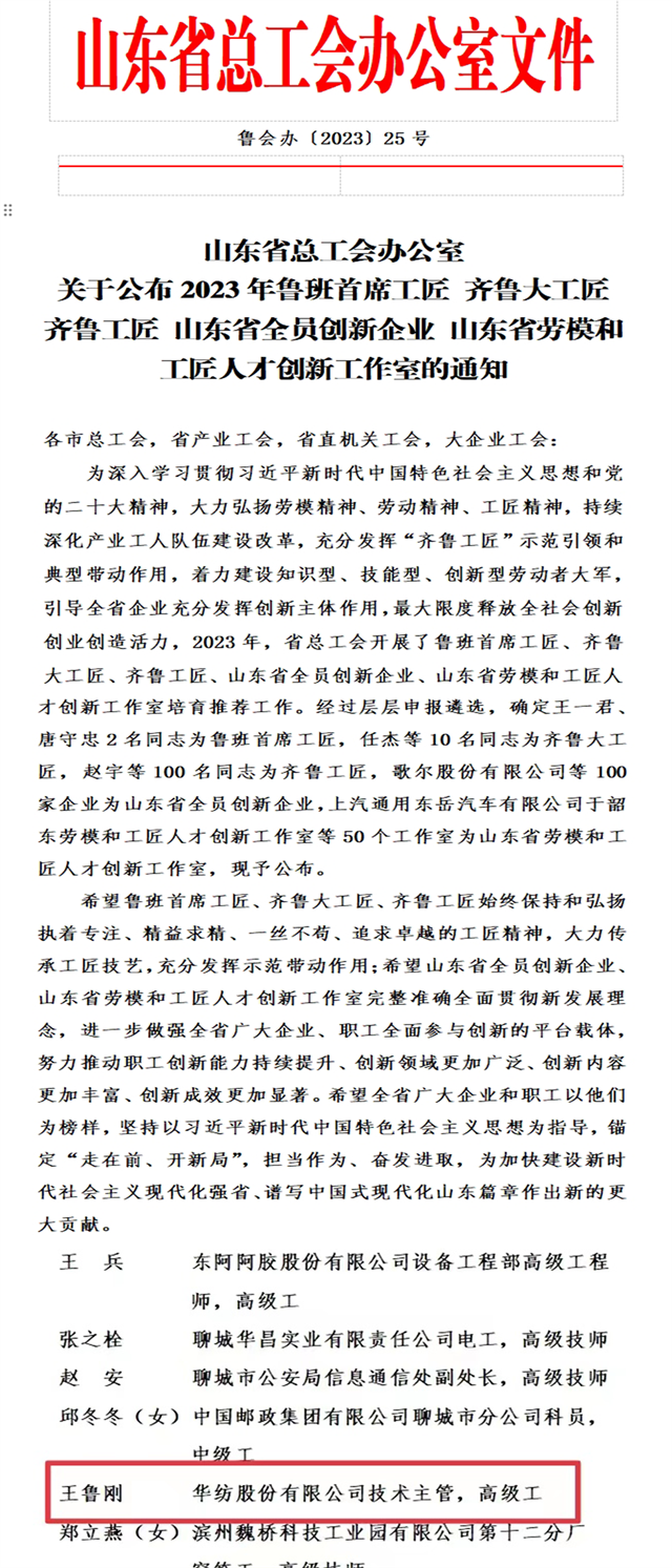 近日,省總工會下發通知,公布了多項獲獎名單,其中,公司面料車間技術主管、高級工王魯剛榮獲第六屆“齊魯工匠”稱號。這是王魯剛繼獲“濱州工匠”、山東省“最佳創新(效益)能手”、“全國紡織行業技術能手”后的又一榮譽。
